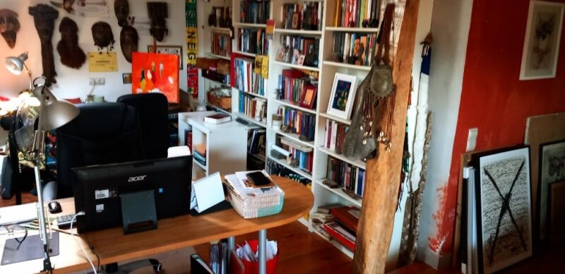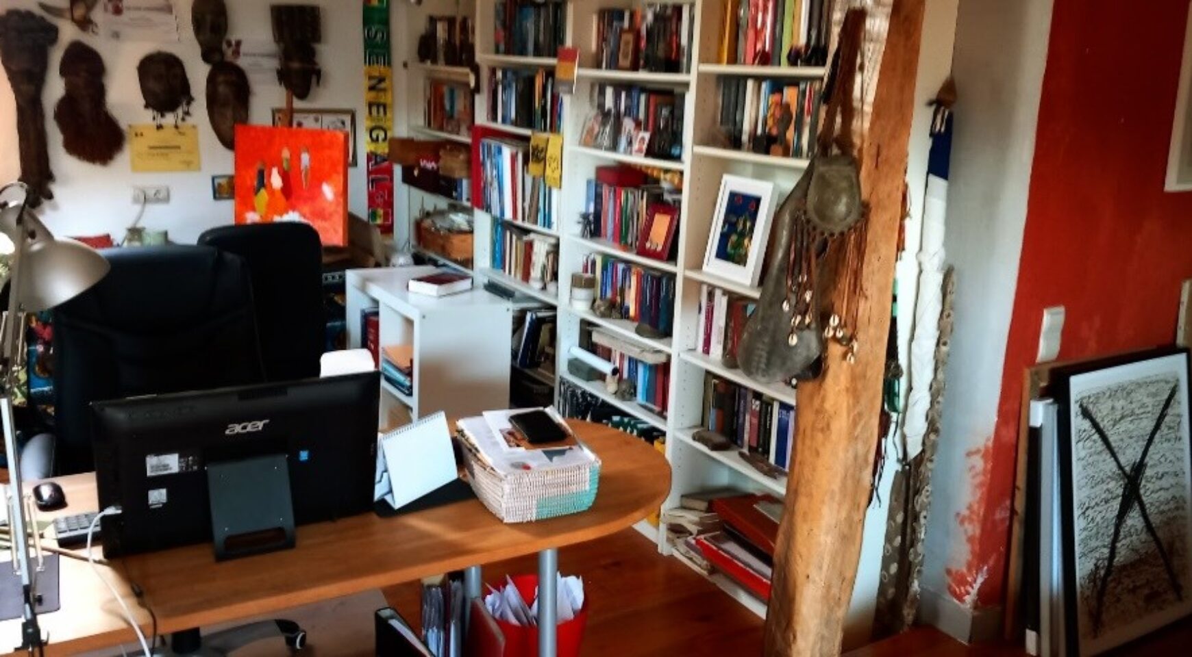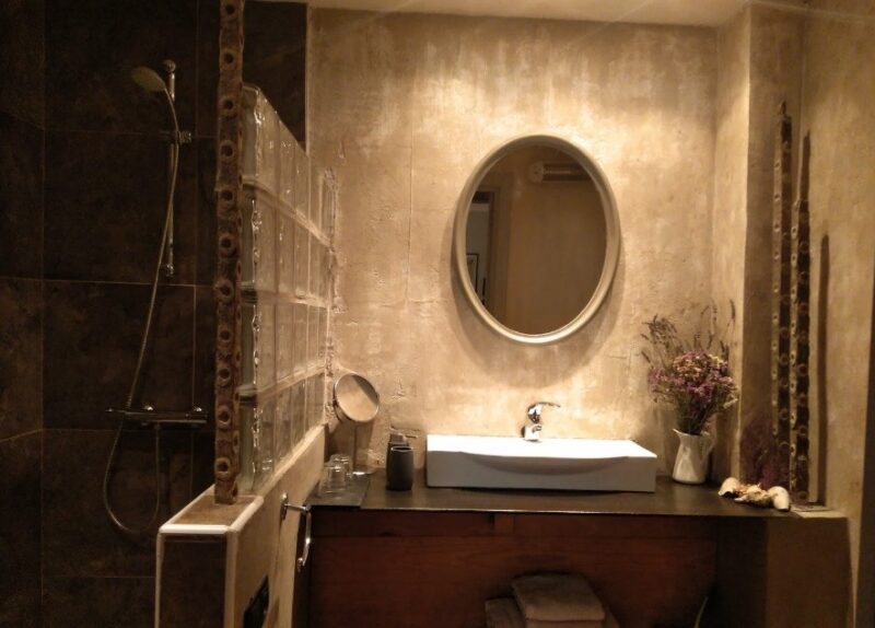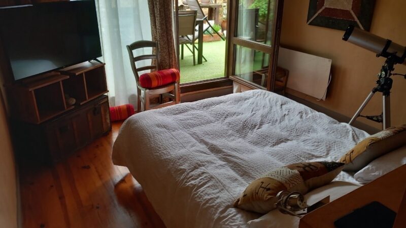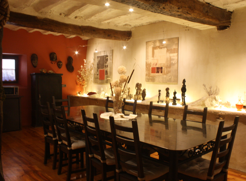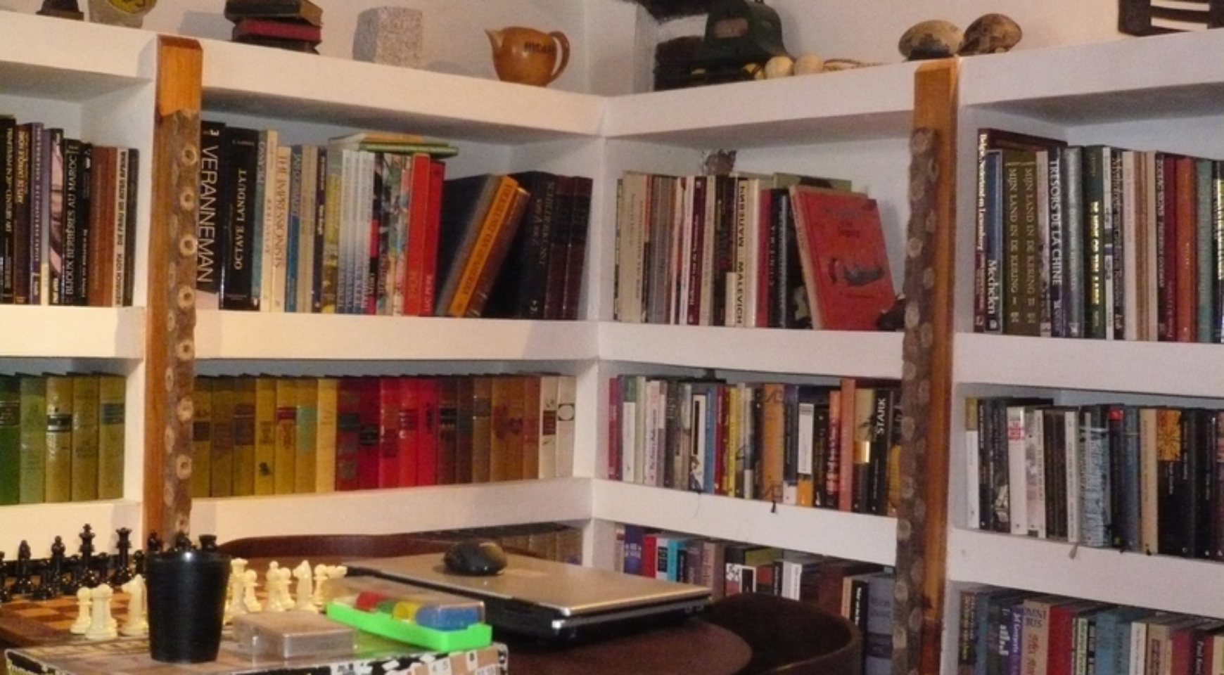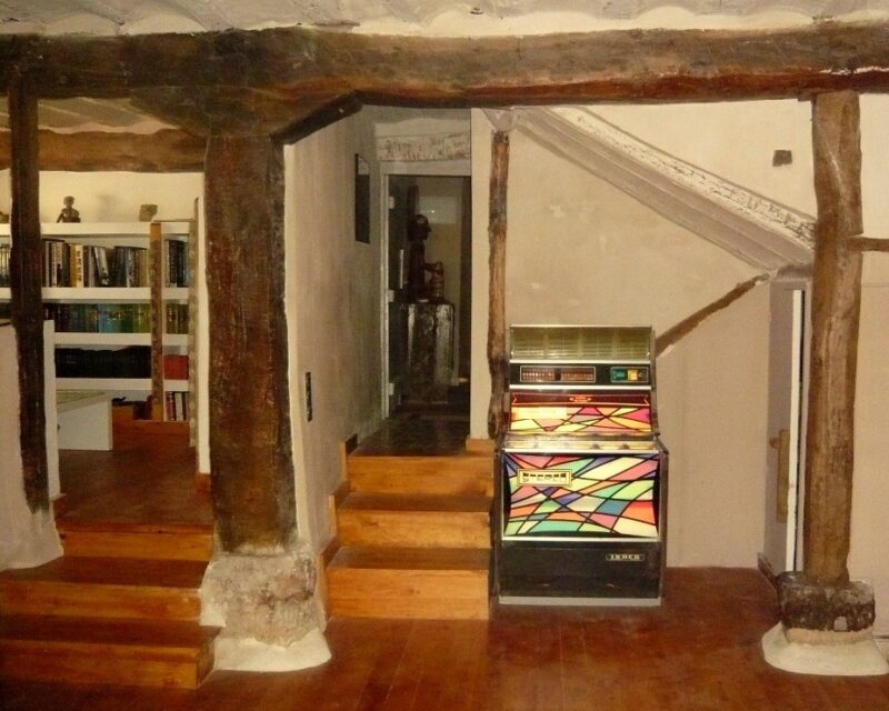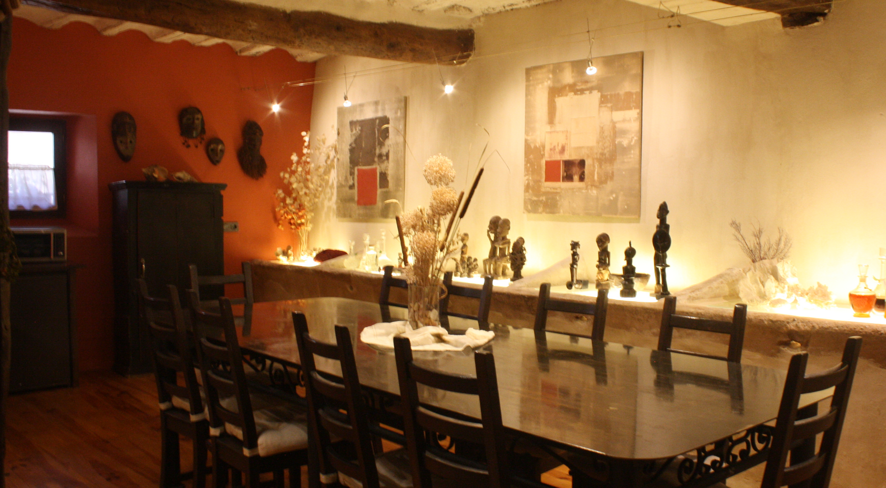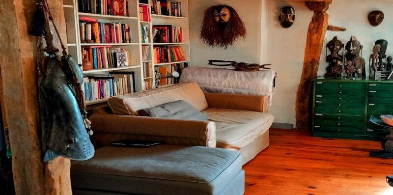 Op de begane grond, achter een privé-ingang met gastentoilet en bergruimte, opent zich een ruim en licht salon-eetkamer met bibliotheek, het warme hart van de woning. De gezellige houtkachel, aangevuld met elektrische verwarming, zorgt voor een unieke sfeer. De eetruimte biedt plaats aan meer dan 10 personen – ideaal voor familie of vrienden.