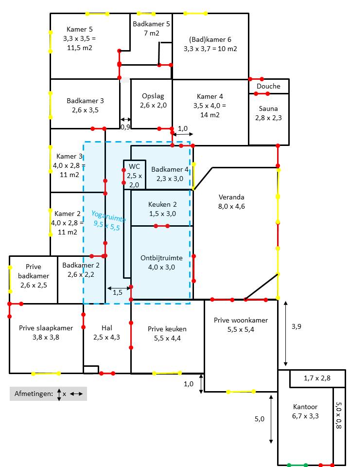 De huidige indeling van de binnenruimte van de accommodatie bestaat uit 2 delen: een woongedeelte en gasten gedeelte, die door een binnendeur gescheiden worden.